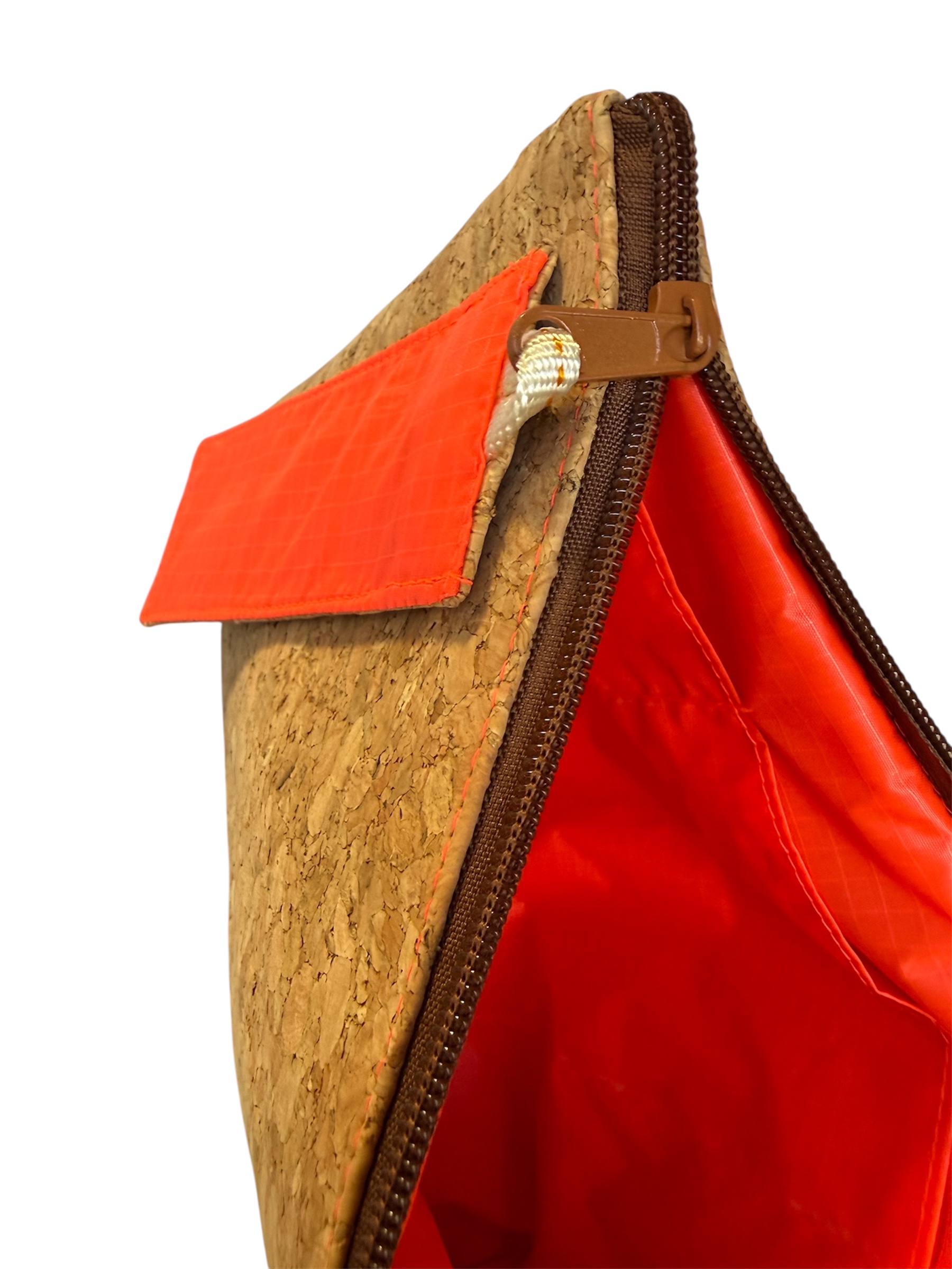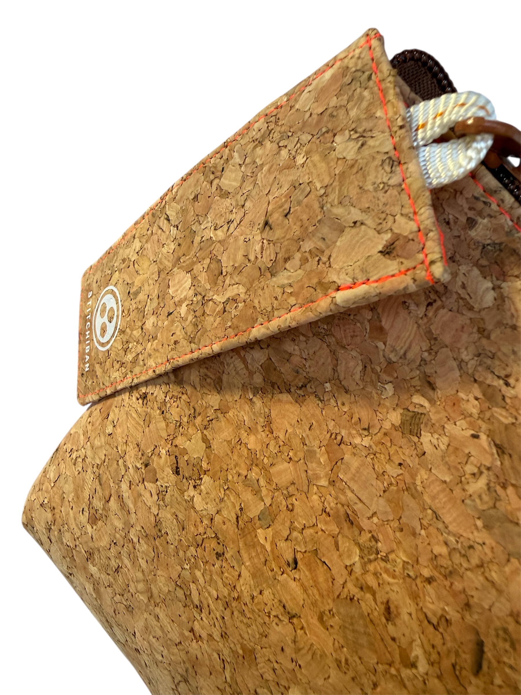 A multifunctional zipped clutch bag with inside pockets made from up-cycled cork exhibition backdrop