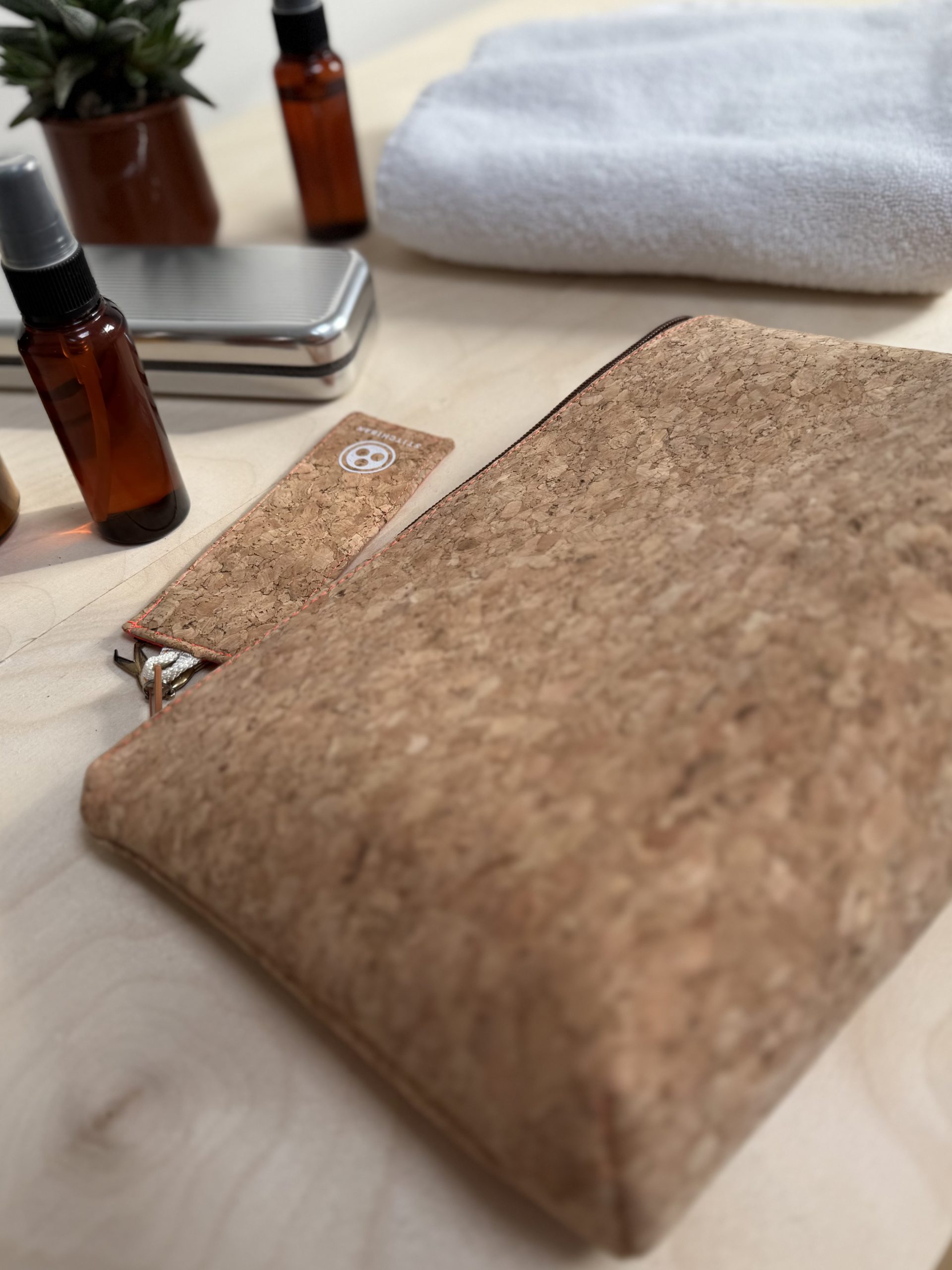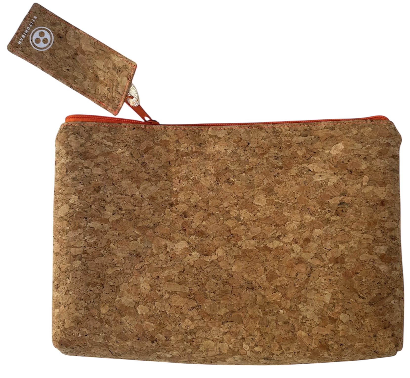 Key features include zipped fastening featuring an elongated cork pull, with inside pockets for phone/wallet; make-up/pens etc.