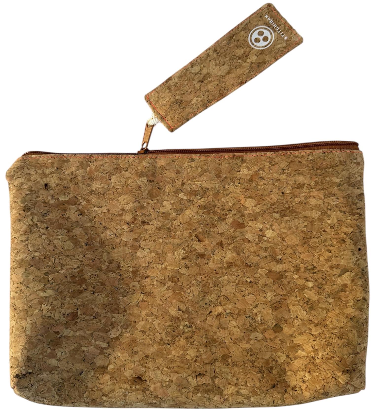 Key features include zipped fastening featuring an elongated cork pull, with inside pockets for phone/wallet; make-up/pens etc.