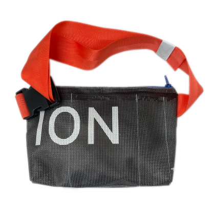 This is the Protean bag and it’s made from a single piece of mesh-type fabric which was previously hung as advertisement for an exhibition at Zabludowicz Collection. As the name suggests this is an adaptable and flexible addition to your accessory wardrobe. It was designed to help keep all your essential stuff close to hand, so whether you’re globetrotting or wobbling around at the home/office you’ll never misplace your phone, keys, cards, hand sanitiser, passport or whatever again! Wear it how you feel, cross body; over the shoulder or around your middle. It is large enough for a 600ml drinks bottle amongst other things, the small external pocket will accommodate cards; keys etc.