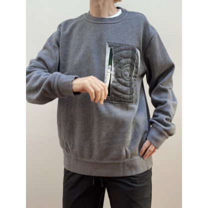 We’ve taken existing garments and rejuvenated them with a modern twist. Our signature addition is a zipped breast pocket, crafted from up-cycled and dead-stock fabrics, giving each sweatshirt a unique, eco-conscious upgrade. The black and white fabric of this pocket originated from an exhibition about George Him at the House of Illustratin. By combining sustainable materials with thoughtful design we create one of a kind pieces that not only reduce waste but also add a distinctive flair to your wardrobe.
