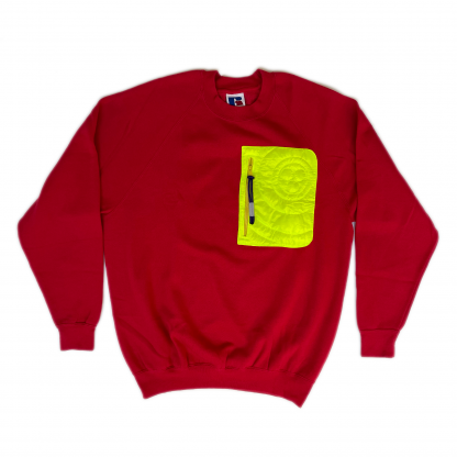 We’ve taken existing garments and rejuvenated them with a modern twist. Our signature addition is a zipped breast pocket, crafted from up-cycled and dead-stock fabrics, giving each sweatshirt a unique, eco-conscious upgrade. The orange ripstop of this pocket originated from a sale of dead-stock fabric at Raeburn, it originally formed part of a parachute. By combining sustainable materials with thoughtful design we create one of a kind pieces that not only reduce waste but also add a distinctive flair to your wardrobe.